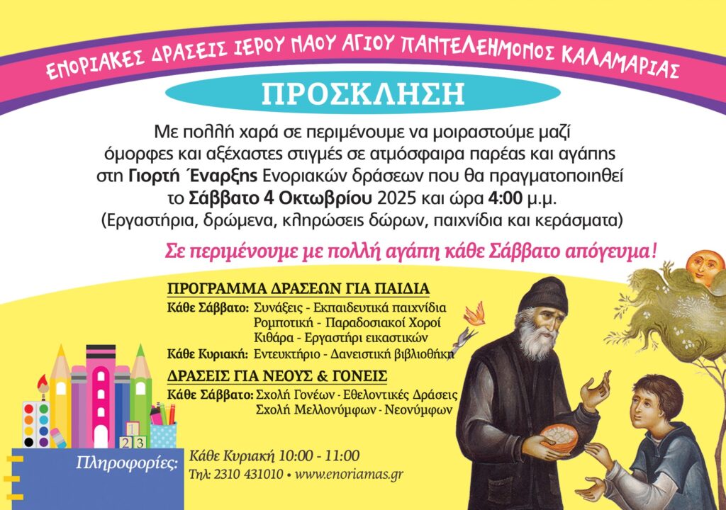 Με πολλή χαρά, σας περιμένουμε όλους να μοιραστούμε μαζί όμορφες και αξέχαστες στιγμές σε ατμόσφαιρα παρέας και αγάπης στη Γιορτή Έναρξης Ενοριακών Δράσεων 2024-25 του Ιερού Ναού Αγίου Παντελεήμονος Καλαμαριάς που θα πραγματοποιηθεί την Κυριακή 6 Οκτωβρίου και ώρα 4 μ.μ. στην Aίθουσα Eκδηλώσεων του Ιερού Ναού.